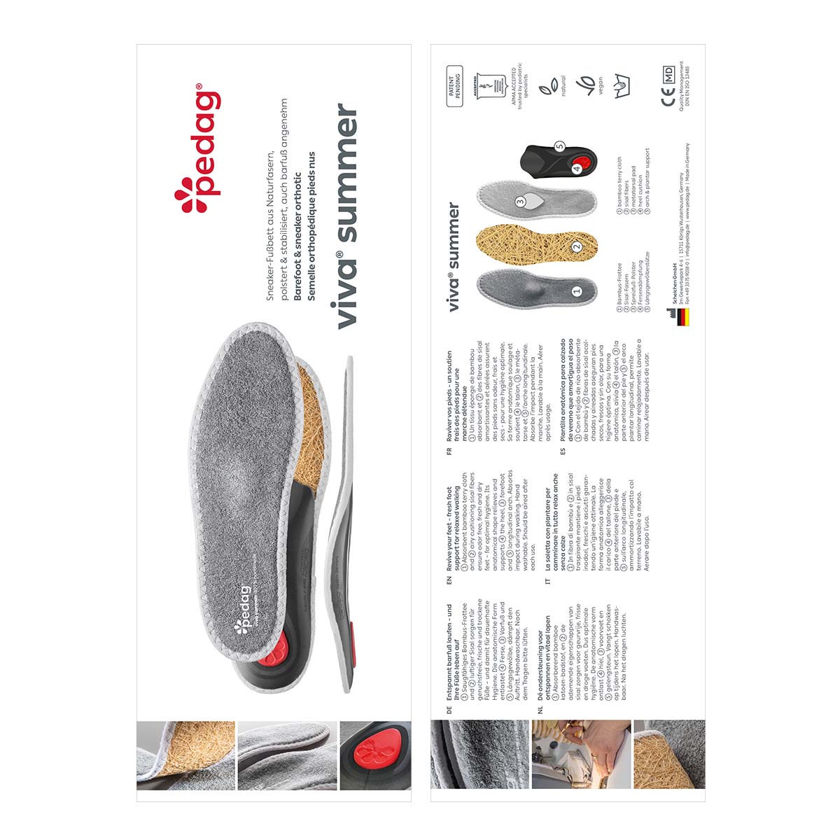 Die sorgfältig durchdachte anatomische Form des pedag Viva Summer entlastet gezielt Ferse, Vorfuss und Längsgewölbe und dämpft jeden Ihrer Schritte sanft ab. Dieses handwaschbare Fussbett ist die ideale Wahl für den umweltbewussten Konsumenten, da es zu 100% vegan ist und als CE-MD zertifiziertes Medizinprodukt höchste Qualitätsstandards erfüllt. Um die Langlebigkeit Ihres pedag Viva Summer zu gewährleisten, empfehlen wir, es nach jedem Tragen zu lüften. Erleben Sie den Unterschied, den ein durchdachtes Design für Ihren Alltag machen kann – mit pedag Viva Summer, Ihrem Partner für ein hygienisches und komfortables Barfussgefühl.