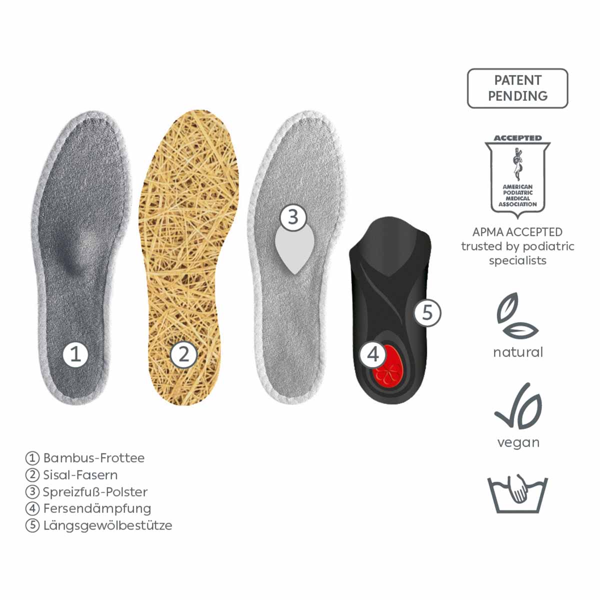 Entdecken Sie das ultimative Barfuss-Erlebnis mit dem pedag Viva Summer Sneaker-Fussbett. Dieses innovative Einlegesohlen-Design aus hochwertigen Naturfasern bietet nicht nur Polsterung und Stabilität, sondern ist auch barfuß äusserst angenehm zu tragen. Geniessen Sie das Gefühl von Freiheit und Leichtigkeit beim Laufen, als würden Ihre Füsse neu belebt. Das saugfähige Bambus-Frottee kombiniert mit luftigem Sisal garantiert geruchsfreie, frische und trockene Füsse. Diese Materialien sind nicht nur für ihre hervorragende Feuchtigkeitsaufnahme bekannt, sondern tragen auch zu einer dauerhaften Hygiene bei.