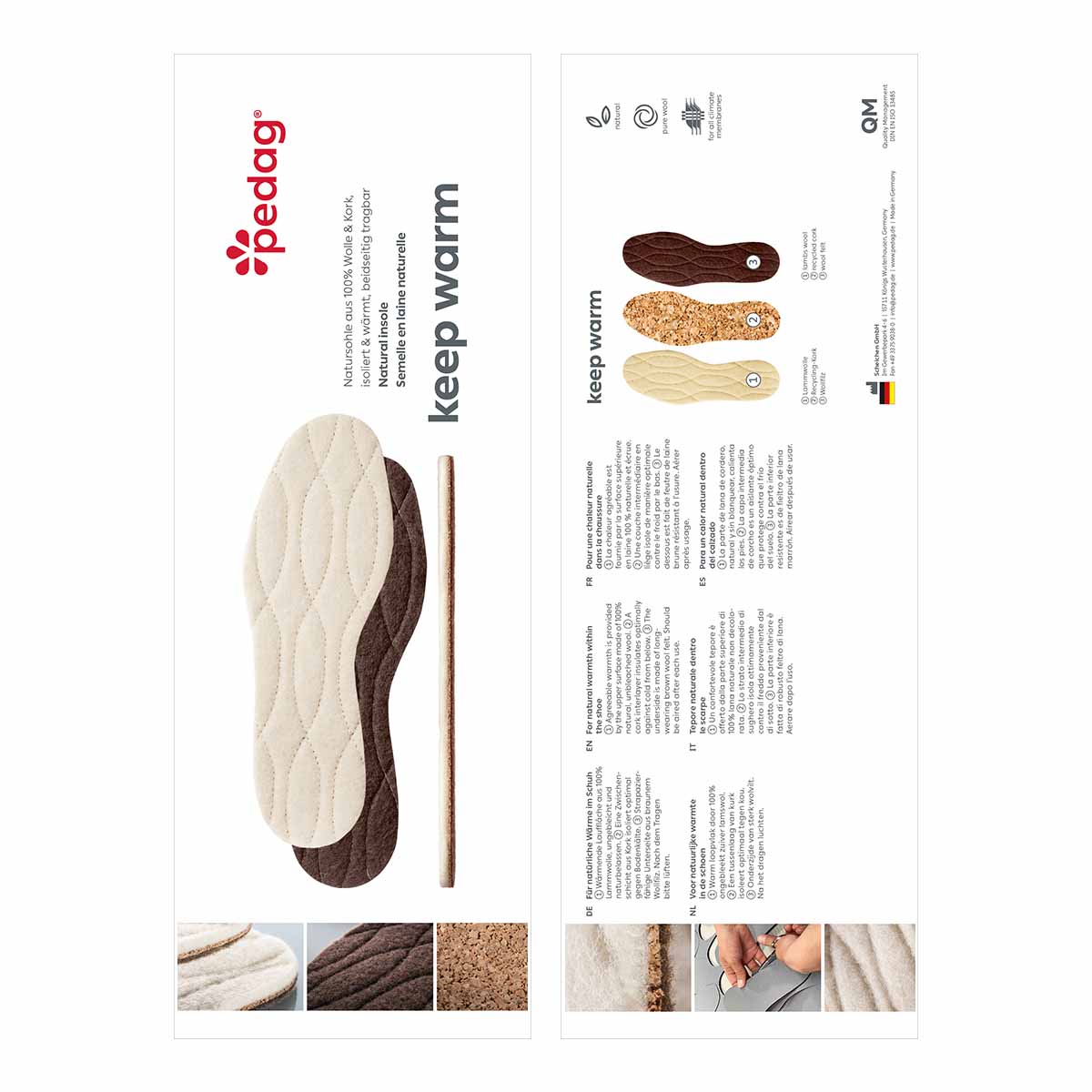 Perfekte Wendesohle für dosierte und natürliche Wärme im Schuh: Die Einlegesohlen Keep Warm von pedag aus reine Lammwolle (beige) wärmt kraftvoll, recycelter Kork isoliert, Wollfilz (braun) wärmt mit halber Kraft.