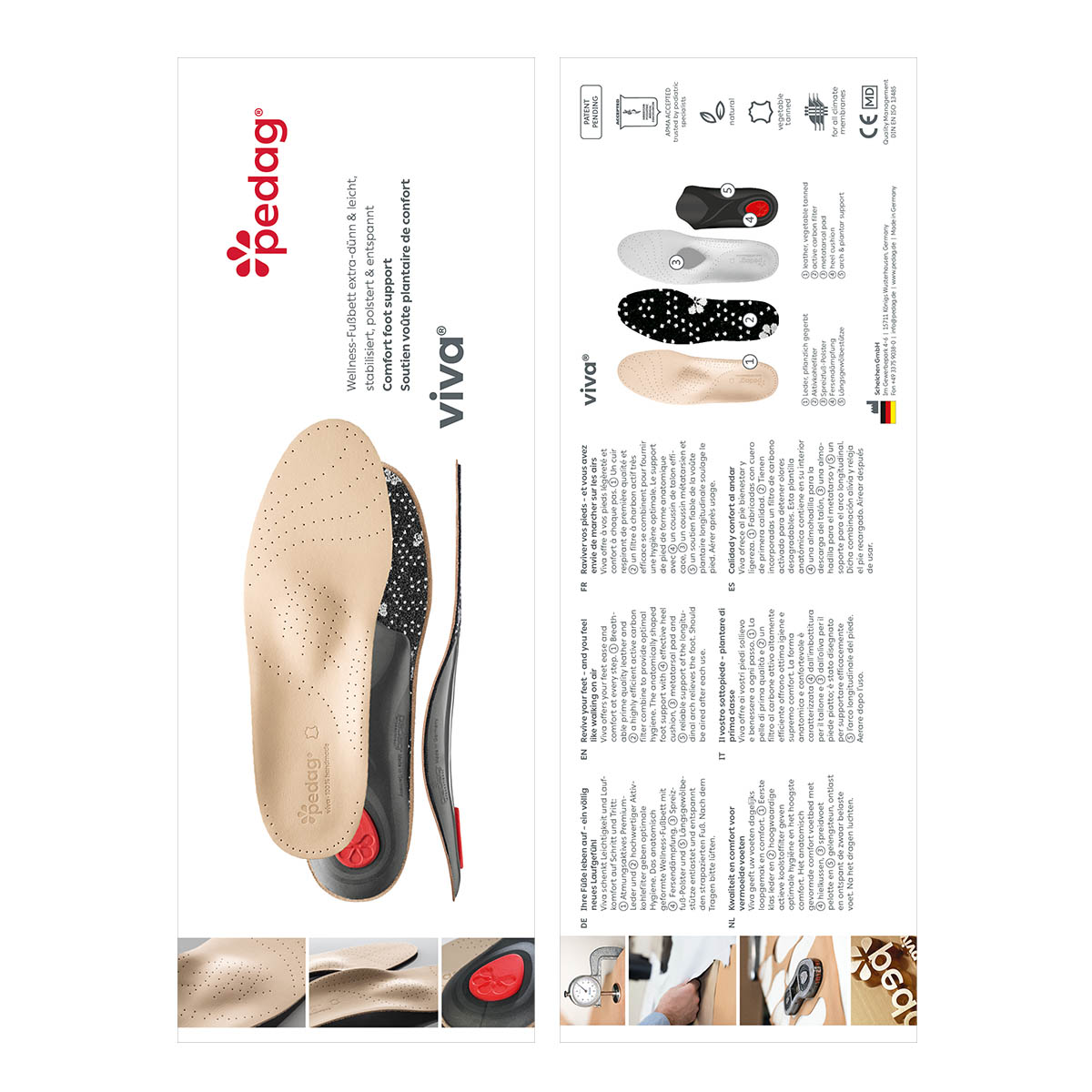 Geben Sie Ihren Füssen das Beste und erleben Sie ein völlig neues Laufgefühl mit der Leder-Schuheinlage Viva Leather von pedag. Ihre Füsse werden es Ihnen danken. Entdecken Sie jetzt die herausragende Qualität und das einzigartige Design dieser Einlegesohle aus Leder.